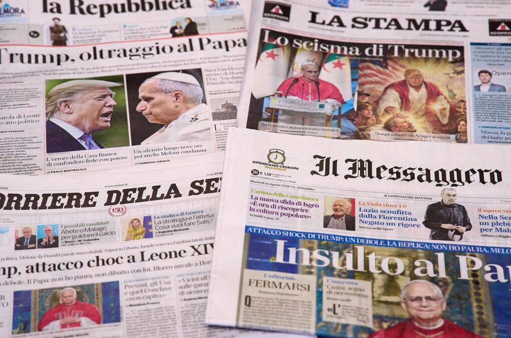 This picture, taken on April 14, 2026, shows the front pages of some Italian newspapers reporting on comments by U.S….