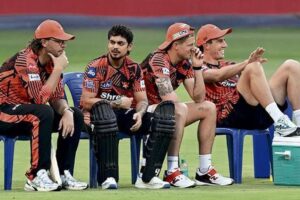 SRH’s Daniel Vettori, Ishan Kishan, and Pat Cummins, during the training session at the M Chinnaswamy Stadium (KSCA), ahead of…