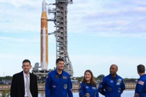 NASA Administrator Jared Isaacman (L) holds a press conference with (L-R) Artemis II mission specialist Jeremy Hansen, Christina Koch, pilot…
