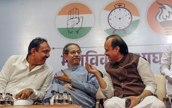 Former Maharashtra CM Uddhav Thackeray with MVA leaders Nana Patole, Balasaheb Thorat, and Ajit Pawar being garlanded during MVA’s ‘Vajramuth’ public rally in Nagpur, in April 2023. Pawar was Deputy CM under Uddhav Thackeray for over two years.