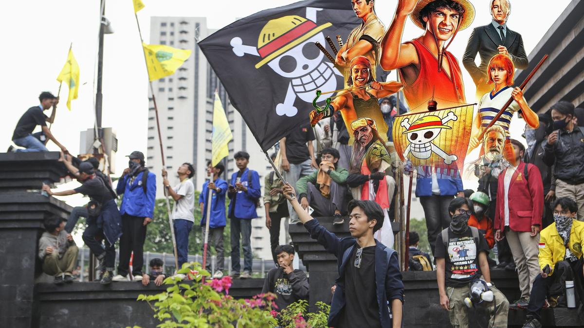 The Straw Hat skull-and-bones pirate flag from Netflix series One Piece (right, top corner) seen at a protest in Jakarta, Indonesia, last year.