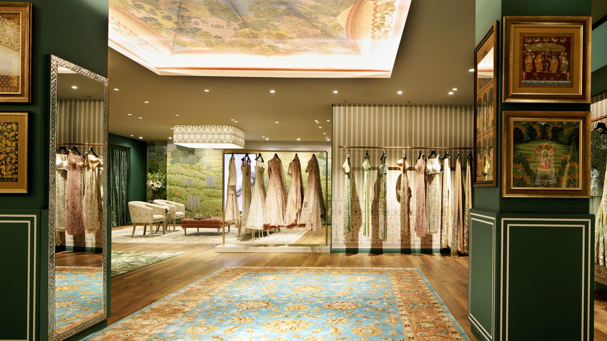 Inside, a pichwai wall painted and embroidered by craftspeople in Rajasthan glows against handwoven furnishings and embroidered lampshades. The space, about 3,000 sq.ft., carries the House’s signature language: contemporary silhouettes framed by centuries-old craft.