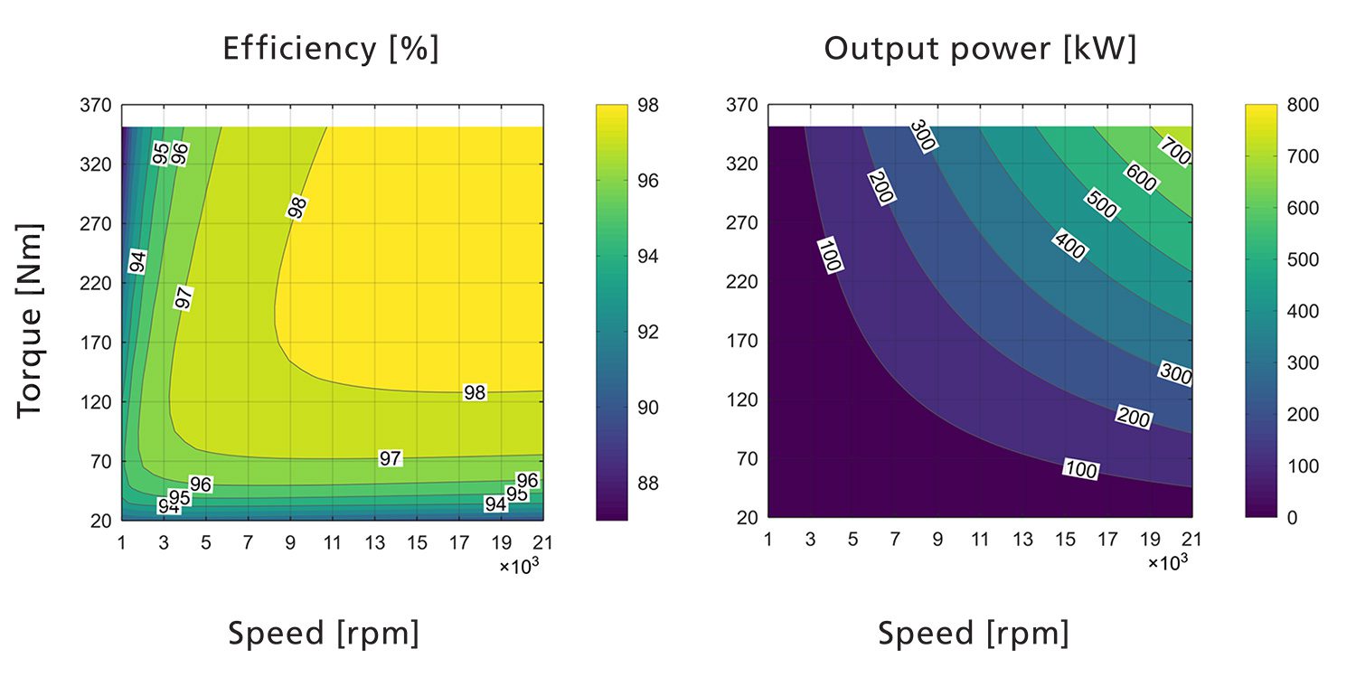 The stator uses a 4×3 phase hairpin winding arrangement with four electrically decoupled sections, each driven by its own inverter. Distributing the windings this way improves fault tolerance: a failure in one section doesn’t take down the others. Hairpin windings also allow higher current density in the slot and better thermal contact with the stator core than conventional round-wire coils. Direct oil spray cooling manages the resulting heat load, enabling rated power at 65 °C coolant temperature.