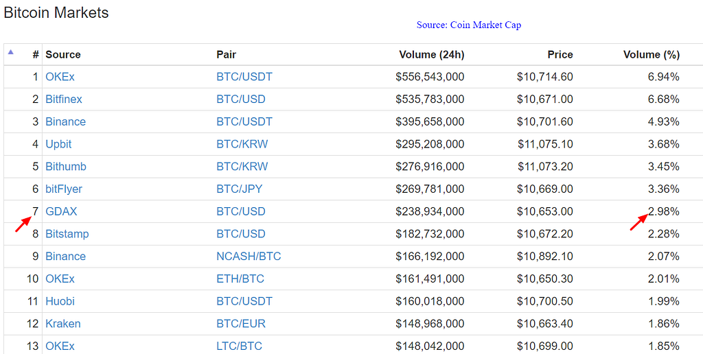 On February 26, between 11: 54 PM PST and 11:55 PM PST, the total volume traded on Gdax was 65 Bitcoins which was worth around $686,440 USD at the time. This resulted in a .557% increase in the price of Bitcoin.