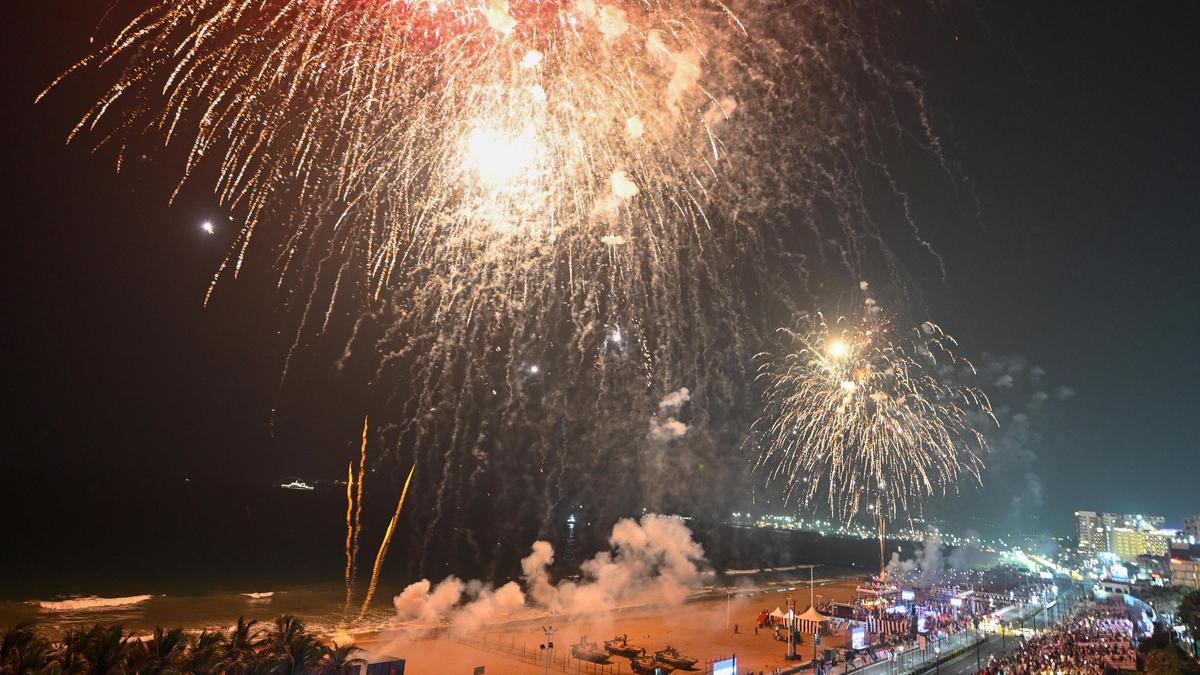 Fire works light up the sky during the International City Parade, during the ongoing MILAN-2026 naval exercise in Visakhapatnam