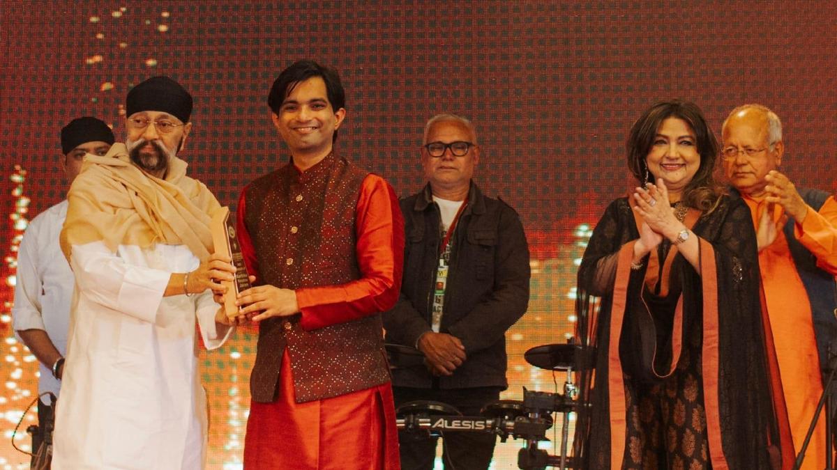 Karthik Jayaram receiving the award from music director Uttam Singh