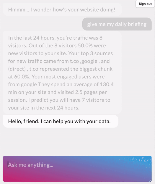 My team and I have implemented and trained a natural language classification engine, Archie.AI, and gave it the power to understand and generate answers from Google Analytics. The bot can give daily briefings about users’ state of business, predict the number of future visitors and answer over 430 related questions. It’s an excellent way to save time when looking for a particular metric or an instant business advice.