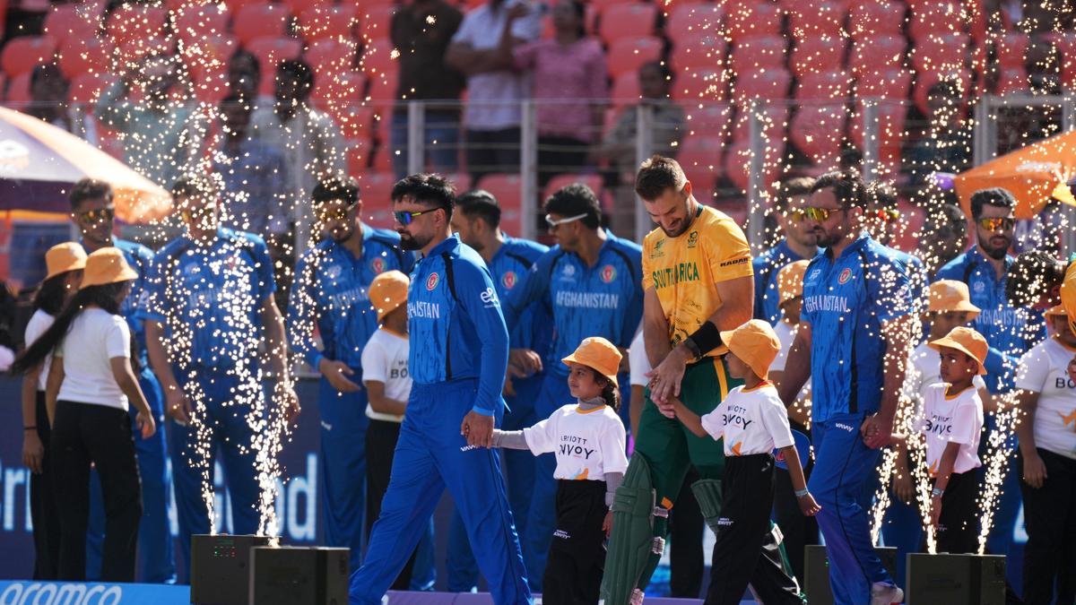 Afghanistan’s captain Rashid Khan and South Africa’s captain Aiden Markram lead their teams for their national anthem during the T20 World Cup.