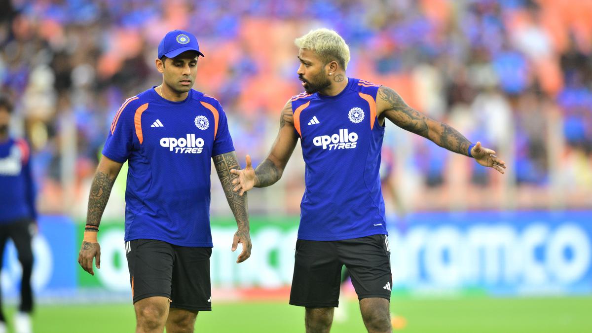 Captain Suryakumar Yadav and Hardik Pandya are seen during a practice session in Ahmedabad