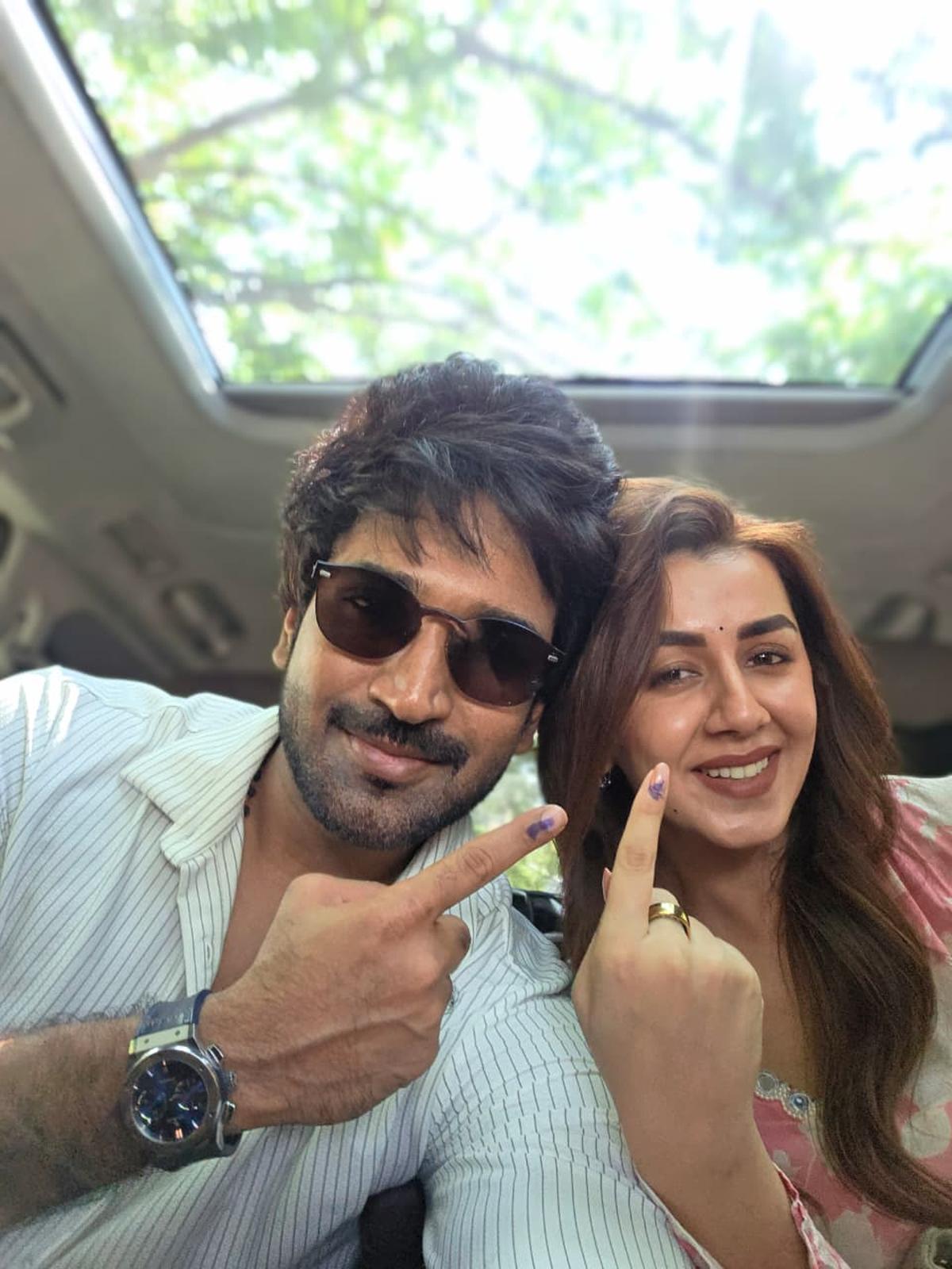Actors Aadhi Pinisetty and Nikki Galrani registered their votes at a polling booth in Chennai on April 23, 2026