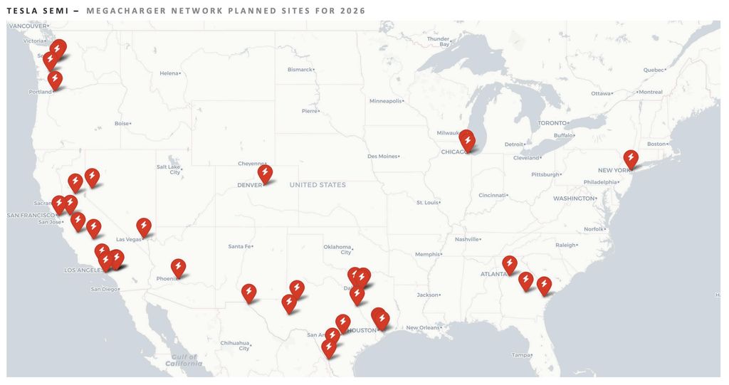 The manufacturer hasn’t provided an exact timeline for the Megacharger rollout, but its Q4 shareholder report contained a map showing 37 locations that would enter service in 2026. Previously, in April of 2025, Tesla’s Semi program boss, Dan Priestly, said at the ACT Expo that the company aimed to have 46 Megachargers online by early 2027.