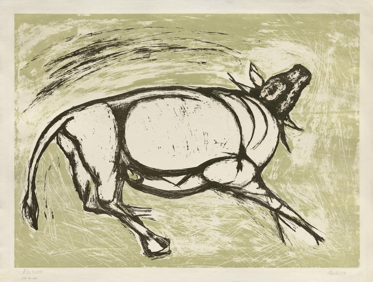 The exhibition revisits many of the motifs that defined his oeuvre. The iconic Falling Figure and Falling Bird series, for instance, capture bodies frozen in the act of collapse — images that echo the trauma and instability of a society emerging from the upheaval of the Partition. The recurring image of the bull, another central motif in Mehta’s work, carries an equally visceral charge. The artist first began sketching bulls while observing animals at the Bandra abattoir in Bombay during the 1950s, and the motif became what he once described as a “compulsive image,” appearing in his paintings across decades.