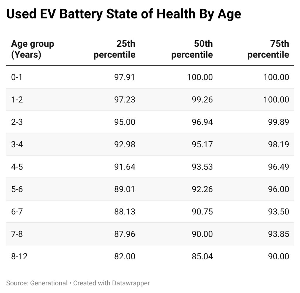 However, Generational also points out that the range of possible outcomes broadens as vehicles get older. And you can see this if you look at the 25th and 75th percentile numbers. The company notes that the lowest-performing 1% of vehicles in the 4-5-year-old bracket returned just over 80% of their original battery capacity—not great.