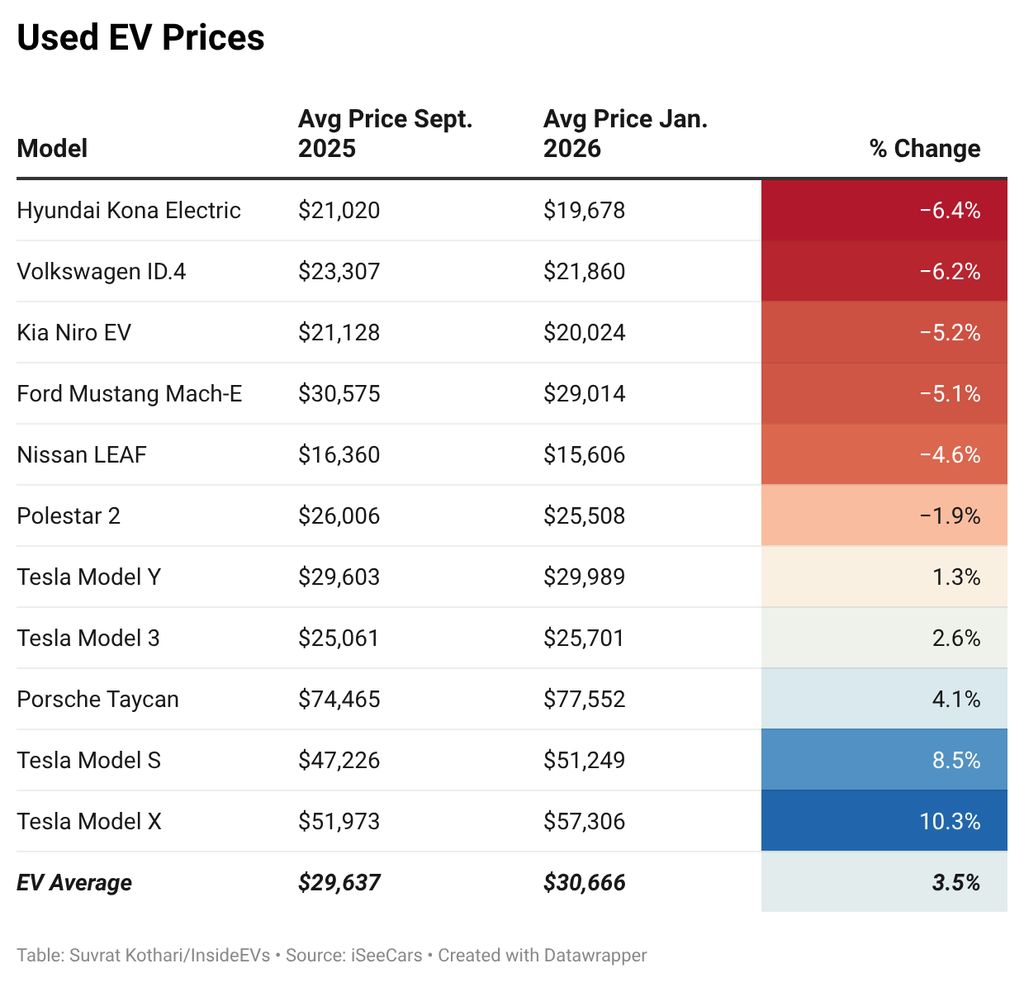 According to a new study by car research firm iSeeCars, the average price of used Teslas increased 4.3% to $31,329 after the end of the tax credits. Meanwhile, the average price of the rest of the used EV market fell 3.6% to $23,738. The firm analyzed over 1.7 million one- to five-year-old used cars and millions of new cars sold between September 2025 and January 2026.