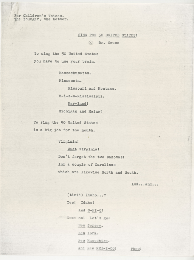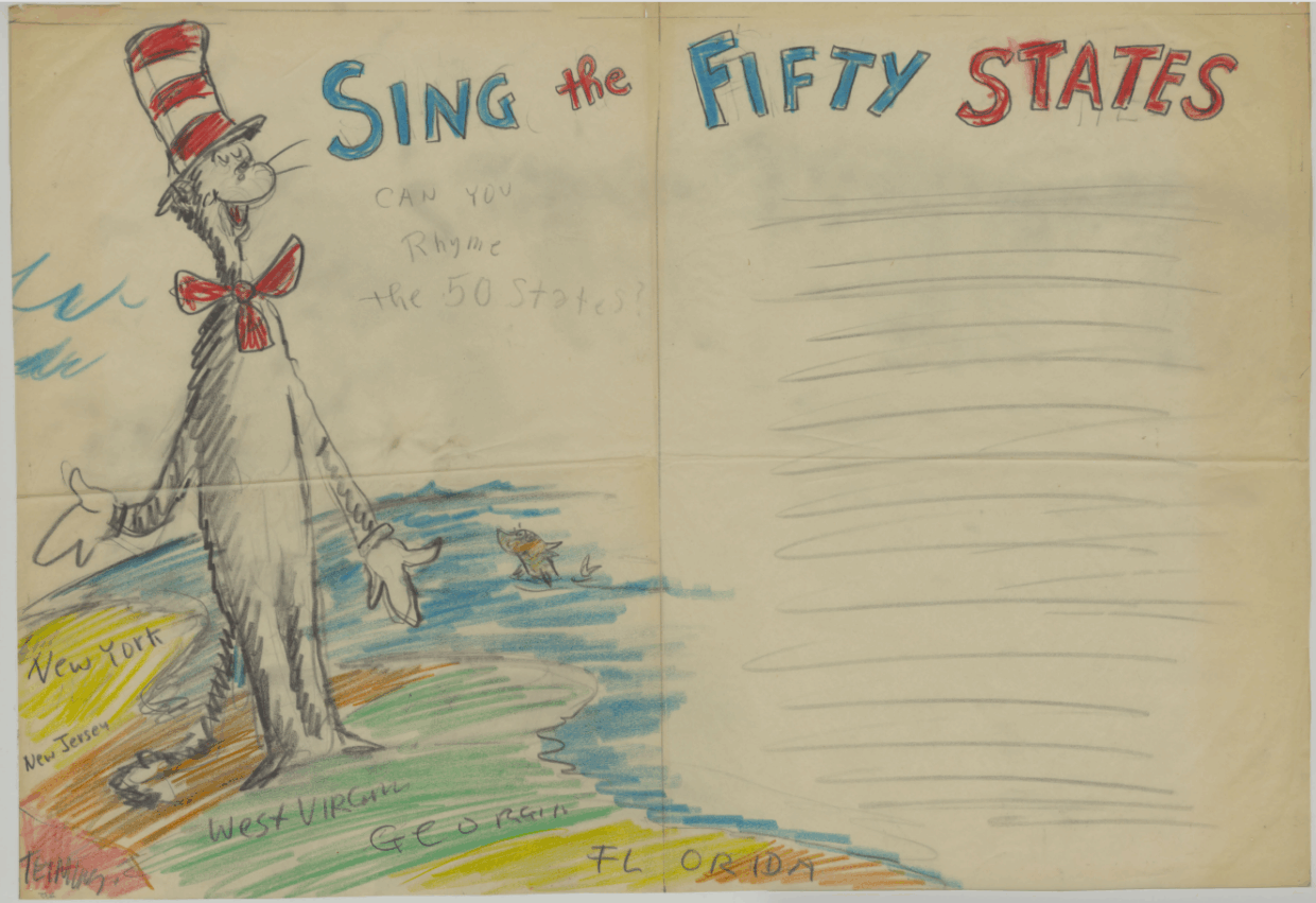 Sing the 50 United States!, a long lost Seussian title, was discovered earlier this year in a shady corner of UC San Diego’s Geisel Library. The unpublished picture book bids readers to “learn and name all fifty states together.”
